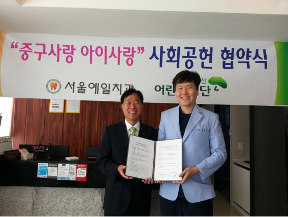 서울예일치과의원(원장 김기도)와 초록우산 어린이재단 대전지역본부(본부장 함영신)는 10월 1일에 서울예일치과의원(대전시 중구 선화동 소재)에서 대전시 중구 관내 빈곤아동 지원을 위한 “중구사랑 아이사랑” 나눔 캠페인 협약식을 진행하였습니다.